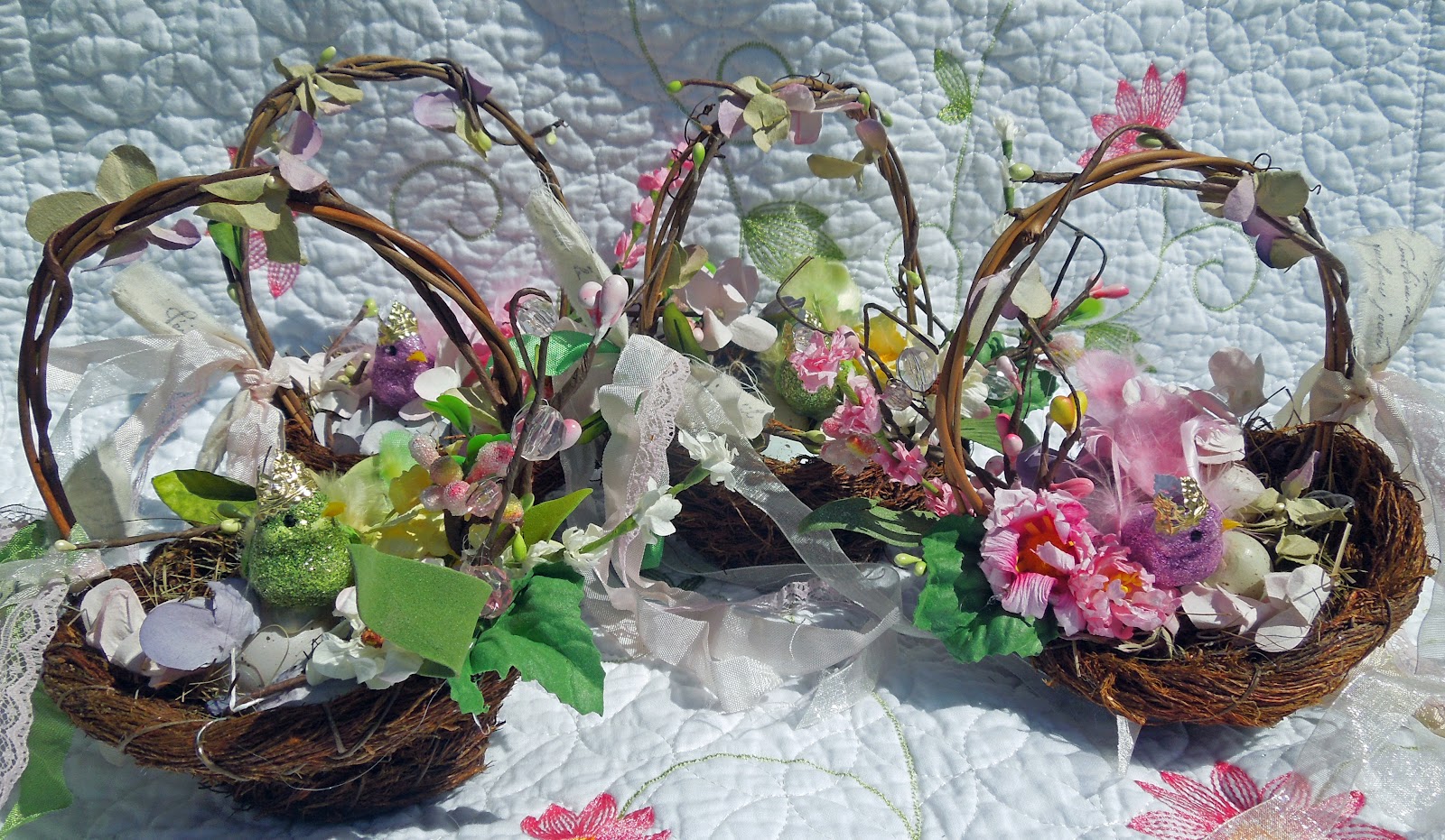 I have been swapping Ornies with a group of friends since Christmas. Cassie VanCuren hosted a Christmas Ornie swap on her blog and since then we have swapped for Valentine's Day and now for Spring/Easter. What a great group of ladies!!! My partners are Cassie VanCuren, An Artful Adventure, Robin Sanchez, Once Upon A Pink Moon, Cami Dilsaver, Creating Myself Creatively, and Jeannie Ryan (Jeannie does not have a blog) . These are the ornies I made this time around. The first set are nests with flowers, eggs ribbon and birds.